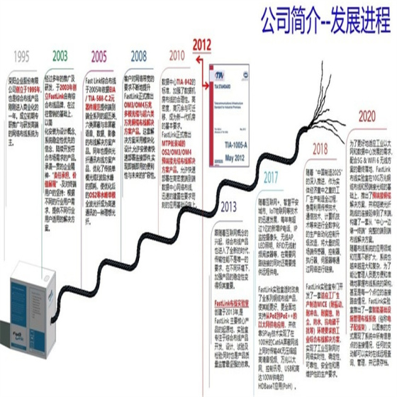 1995年荣阳企业股份有限公司创立于1995年,也是综合布线产品刚刚进入商业化的一年。成立初期专职推广与研发高端的网络布线系统为主。2003年经过多年的推广及研发,于2003年创立FastLink自有综合布线品牌,在过往营销的基础上,以简化安装为设计概念、系统稳定性优先的信念,陆续开发符合市场需求的产品。承袭一贯的企业精神-“责任承担、价值展现”-及对终端用户的坚持:根据不同的行业用户需求,提供不同行业用户适用的解决方案。2005年Fast Link综合布线于2005年依据EIA / TIA568-C.2元器件规范提供端到端全系列的超五类、六类屏蔽与非屏