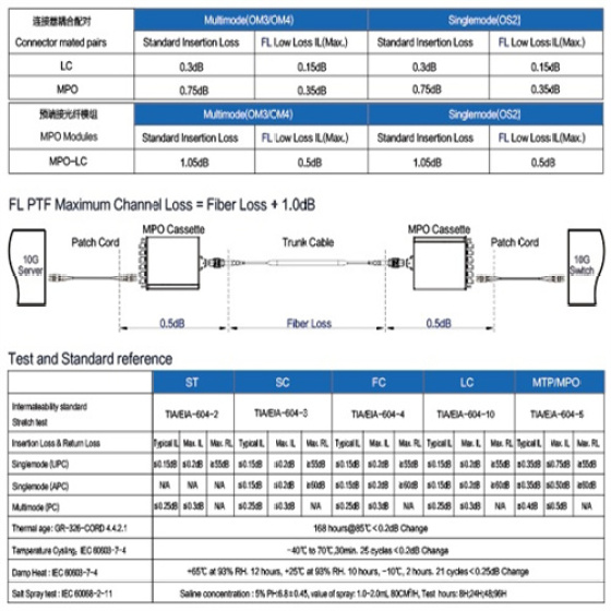 产品优势 - FastLinkcabsys预端接光纤模组提供OM4激光优化多模及OS2零水峰单模之应用选择;符合ANSI/TIA 568.3-D及ISO/IEC 11801 2nd Amendment标准。 - MTP/MPO采用0.35dB低衰减光纤连接器,链路通道具有极佳的衰减余量,使您在设计布线系统时具有最佳之设计弹性。 - 多模MTP/MPO连接器为Physical Contact polish接口;单模MTP连接器为Angled Physical Contact polish接口。 - 出厂时检验光学性能及可靠性,确保链路品质;具有安装灵活性及稳定性,特别适合数据中心快速部署的要求。 - 支持10G、40G及100Gbps序列或并列传输应用架构。 - 符合AN