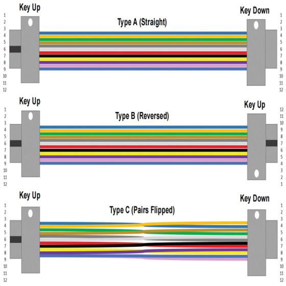 TIA 568-C所定义的A、B、C三种极性Type A 使用A型MPO适配器(key up to key down)和A型直通骨干(key up to key downTrunk cable)。只需有一个预端接光纤模组类型。 它的使用问题是:配置A-Type光信道链路时需反转另一边的光纤跳线极性。Type B 使用B型MPO适配器(key up to key up)和B型直通骨干(key up to key up Trunk cable)。 在配置Type-B光信道链路时仅需反转安装其中一边的预端接光纤模组(Master-Slave); Type-B光通道使用的光纤跳线为标准跳线(Key up to key up),没有反转跳线极性的问题。 (FastLink 建议采用Type-B